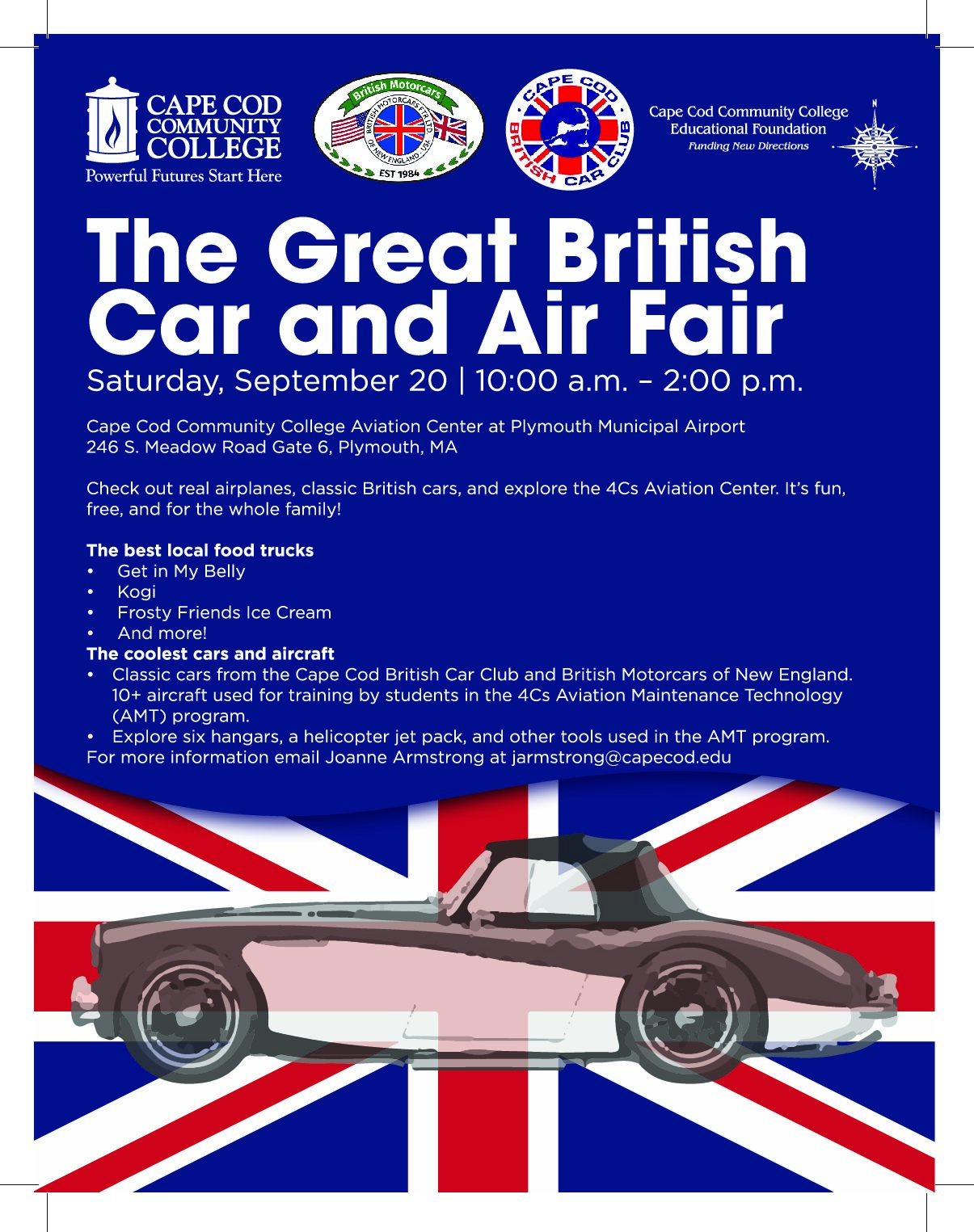 Thank you all for signing up to participate in the first Great British Car & Air Fair hosted by the Cape Cod Community College Aviation Maintenance Technology program. We have 32 cars and we’re hoping for a great public turnout. There will also be tours of the facility during the day.