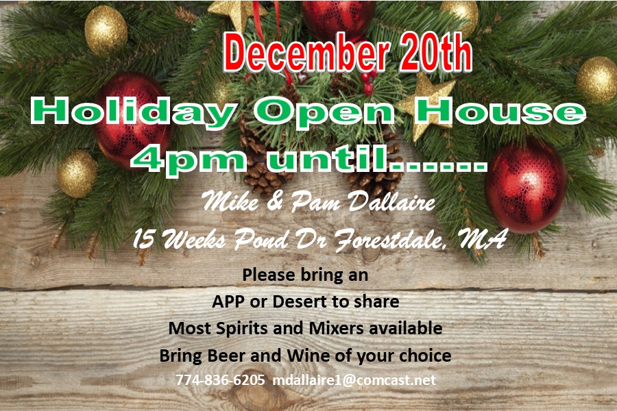The Annual Dallaire Holiday Party & Open House When: SATURDAY, DEC 20th Time: 4 PM TIL….??? Where: Dallaire’s Home, 15 Weeks Pond Drive, Forestdale, MA CCBCC members are invited. Come on out and